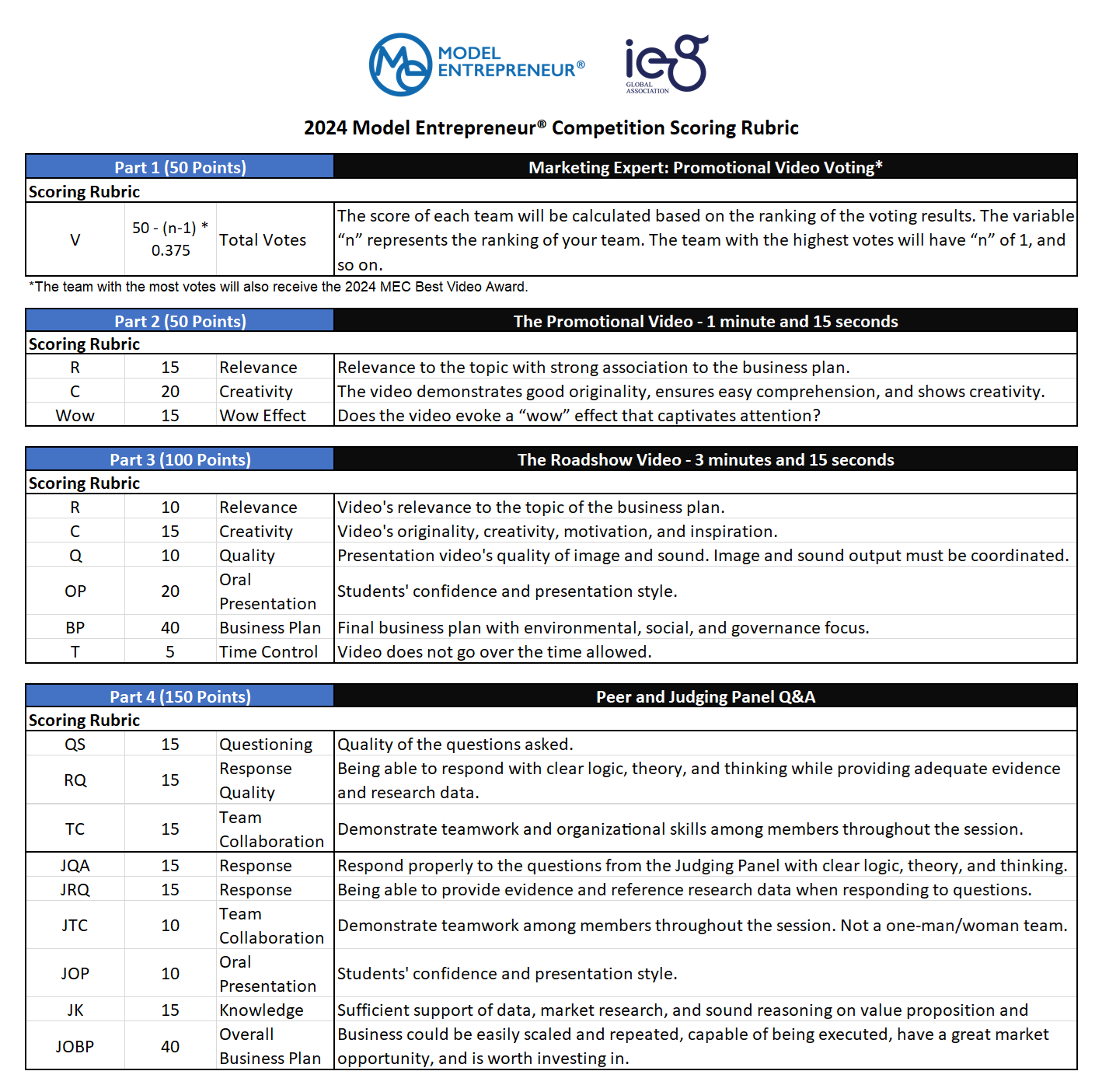 • The Final Round will be evaluated in 4 parts: Promotional Video Voting, Promotional Video, Roadshow Video, and PRT and Judging Panel Q&A.
