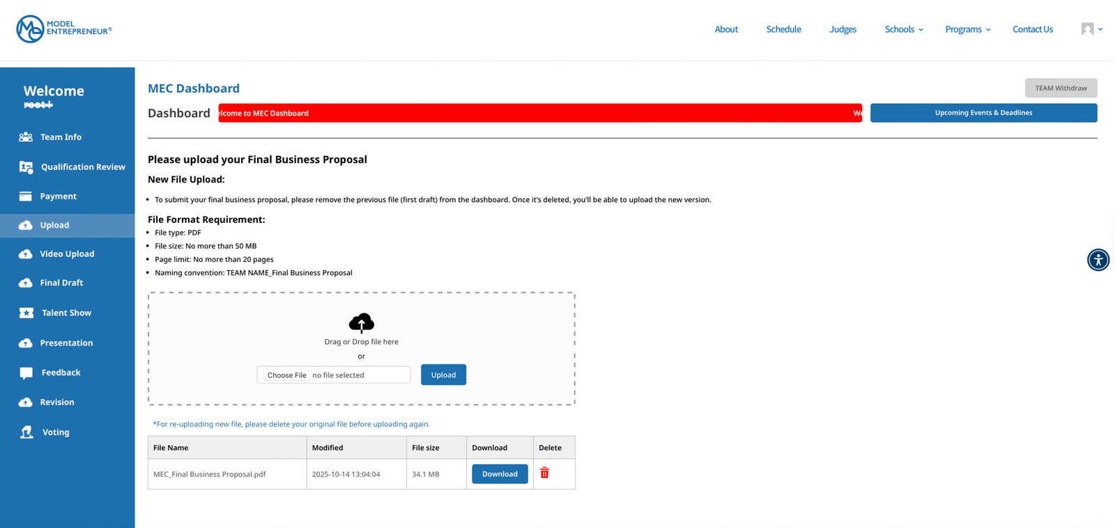 You are required to submit three key materials: a Business Proposal, a Commercial Video and an One-Pager. Please ensure that all of the files are uploaded to the designated sections on the MEC dashboard by the deadlines.
